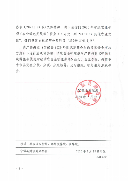 关于下达2020年省级农业(农业绿色发展等)统筹整合涉农资金的通知