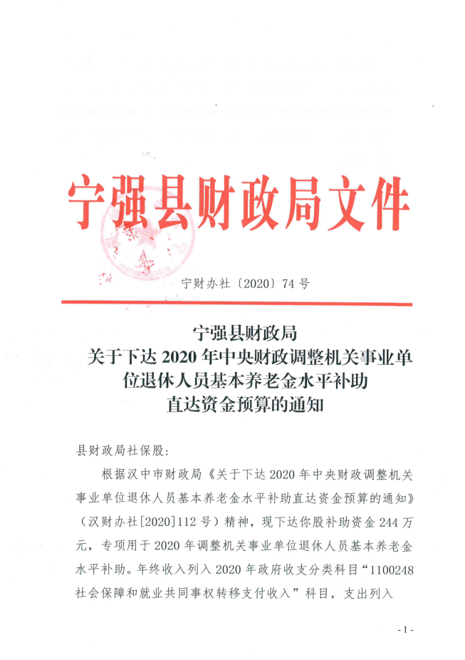 关于下达2020年中央财政调整机关事业单位退休人员基本养老金水平补助直达资金预算的通知